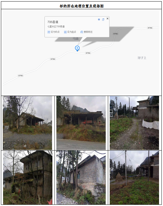 標(biāo)的位于畢節(jié)市七星關(guān)區(qū)燕子口鎮(zhèn)峨峰溝村陸家灣組,房屋總層數(shù)二層,建成于1990年。房屋租賃期限:2018年7月1日至2021年7月1日??偨ㄖ娣e:454.34㎡,其中套內(nèi)建筑面積:392.7㎡,共有分?jǐn)偯娣e:61.64㎡;土地面積:282.49㎡,磚混結(jié)構(gòu),無房產(chǎn)證,國有土地使用證:畢市國用(95)字第24021號,用途為:商業(yè)用地,土地性質(zhì)為:劃撥用地。