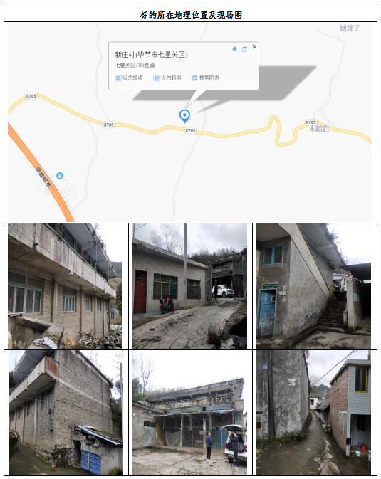 標(biāo)的位于畢節(jié)市七星關(guān)區(qū)水箐鎮(zhèn)星火村,房屋總層數(shù)二層,建成于1996年??偨ㄖ娣e:858.63㎡,其中套內(nèi)建筑面積:793.45㎡,共有分?jǐn)偯娣e:65.18㎡;土地面積:1320.84㎡,磚混結(jié)構(gòu),無房產(chǎn)證,國有土地使用證:畢市國用(99)字第3-002號,用途為:倉庫,土地性質(zhì)為:劃撥用地。