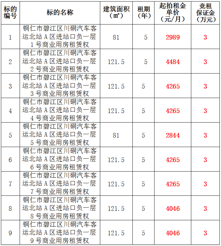 1、銅仁市碧江區(qū)川硐汽車客運(yùn)北站A區(qū)進(jìn)站口負(fù)一層1號(hào)門面租賃權(quán),面積:81㎡,租賃期:5年,起拍租金單價(jià):2989元/月,競(jìng)租保證金:3萬元;