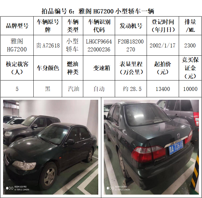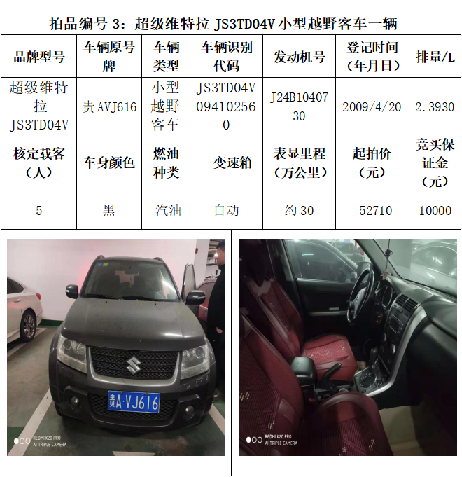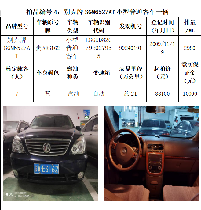 受委托,本公司定于2021年3月26日(星期五)下午14:30時,在貴陽市中華南路20號新大陸數(shù)碼廣場10樓D座拍賣廳公開拍賣以下車輛:普拉多越野車1輛、超級維特拉越野車1輛、別克商務(wù)旅行車1輛、輝騰轎車1輛、途勝越野車1輛、雅閣轎車2輛、奧迪轎車1輛,共計8輛車。