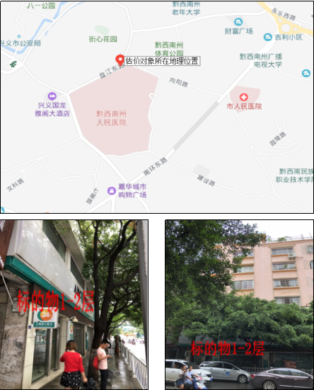 1、標(biāo)的物位于興義市盤江東路49號(hào)A幢第1號(hào)1-2層的綜合房地產(chǎn),標(biāo)的物建成于2005年,南面臨盤江東路,其余三面均臨多層建筑樓棟?;旌辖Y(jié)構(gòu),水電、生活燃?xì)?、消防等設(shè)施齊全。使用正常,維護(hù)狀況較好,普通裝修,地面鋪地磚,墻面及頂面刮瓷粉刷乳膠漆,鋁合金窗,防盜門、卷簾門、木門。