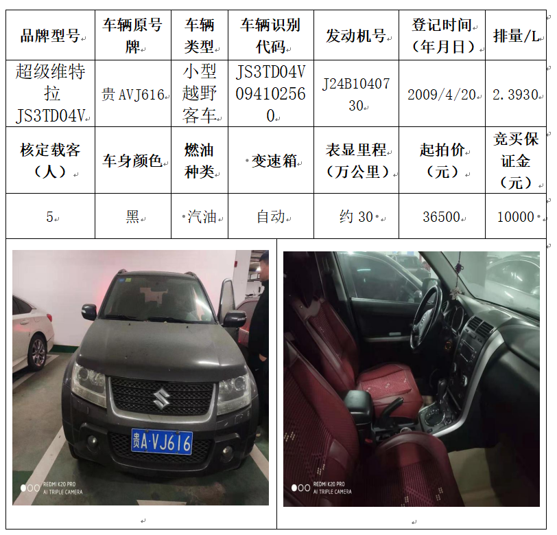 拍品編號7:超級維特拉JS3TD04V小型越野客車一輛