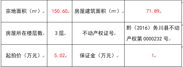 1、標的是位于務川縣豐樂鎮(zhèn)豐樂村豐樂老街場上(農(nóng)行營業(yè)所)3-2號的住宅房地產(chǎn),包括建筑物、分攤的土地使用權(quán)及公共設施配套,該標的建成于1997年,房屋總樓層數(shù)為6層,該標的位于第3層,房號為3-2,房屋結(jié)構(gòu)為混合結(jié)構(gòu),標的東面臨街道,其余三面均臨建筑樓棟,其中宗地面積為150.60㎡,房屋建筑面積71.89㎡。