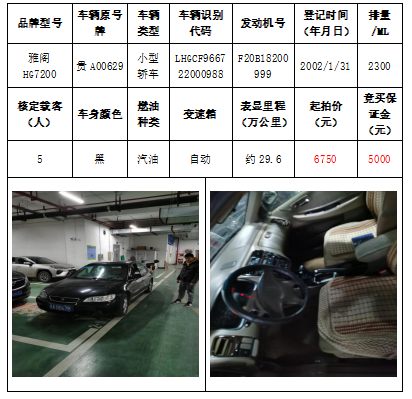 拍品編號(hào)1:雅閣HG7200小型轎車(chē)一輛