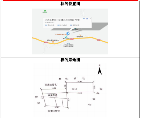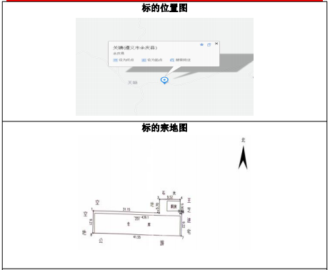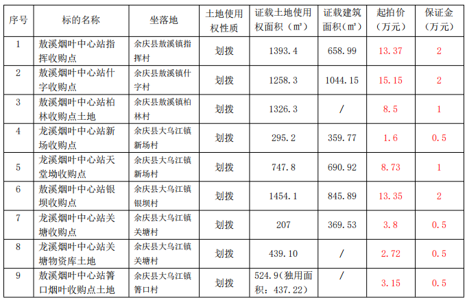 該標(biāo)的位于余慶縣龍溪鎮(zhèn)關(guān)塘村,標(biāo)的建筑物已拆除,證載土地面積:約493.1㎡,土地使用權(quán)性質(zhì):劃拔,土地證載用途:煙葉收購,土地證號(hào):余國(guó)用(2007)第905號(hào)。