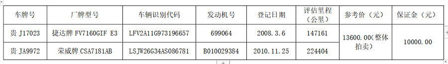 一、拍賣標(biāo)的:貴J17023、貴JA9972機(jī)動(dòng)車各一輛。